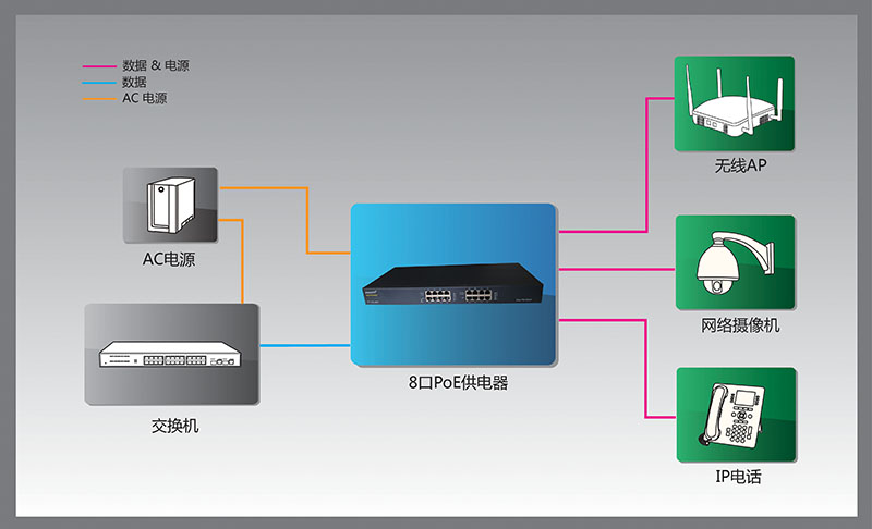 WH-PSE801GW是一款8端口以太網供電器,該供電器適應于室內使用,在176VAC-265VAC輸入電壓都能正常工作,提供+48V電力輸出,該供電電源與網絡終端設備之間通過超5類線纜連接,適用于10/100/1000M網絡環境。